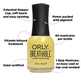Our ORLY Breathable range doubles up as both a treatment and colour nail polish. Developed with a new advanced oxygen technology, it allows the nail bed to breathe. Our Sour Time To Shine, lemon lime crème Breathable vegan certified Polish is great for: