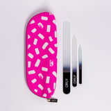 The ORLY 3 Piece File Set with Pink Brush Stroke Case contains a duo set of crystal nail files and a crystal glass cuticle tool housed in a beautiful rose gold case that is perfect for keeping in a handbag or using while travelling.